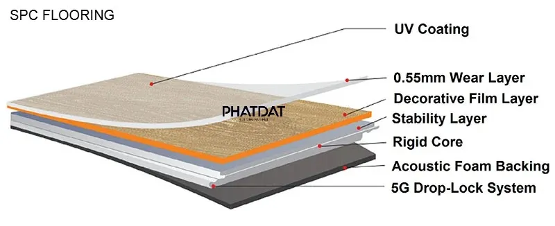 Sàn nhựa hèm khóa SPC (Stone Plastic Composite) là dòng vật liệu lót sàn thế hệ mới nhất, được cấu tạo từ bột đá thiên nhiên siêu mịn kết hợp với nhựa nguyên sinh PVC. Đây là giải pháp đột phá thay thế cho sàn gỗ công nghiệp và sàn nhựa dán keo truyền thống nhờ cấu trúc “xương cứng” đặc biệt, mang lại độ bền vĩnh cửu và khả năng thích nghi tuyệt vời với khí hậu nhiệt đới.