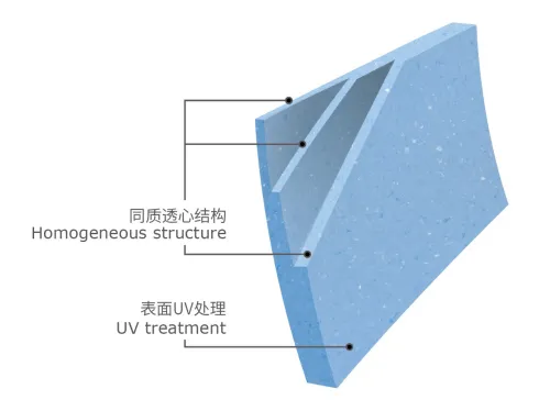 Xử lý bề mặt PUR Standard: Bề mặt được gia cố lớp bảo vệ PUR, giúp đóng kín các lỗ li ti trên nhựa. Công năng này giúp sàn chống bám bẩn tuyệt đối, kháng hóa chất và không cần đánh bóng bằng sáp định kỳ, tiết kiệm chi phí bảo trì.