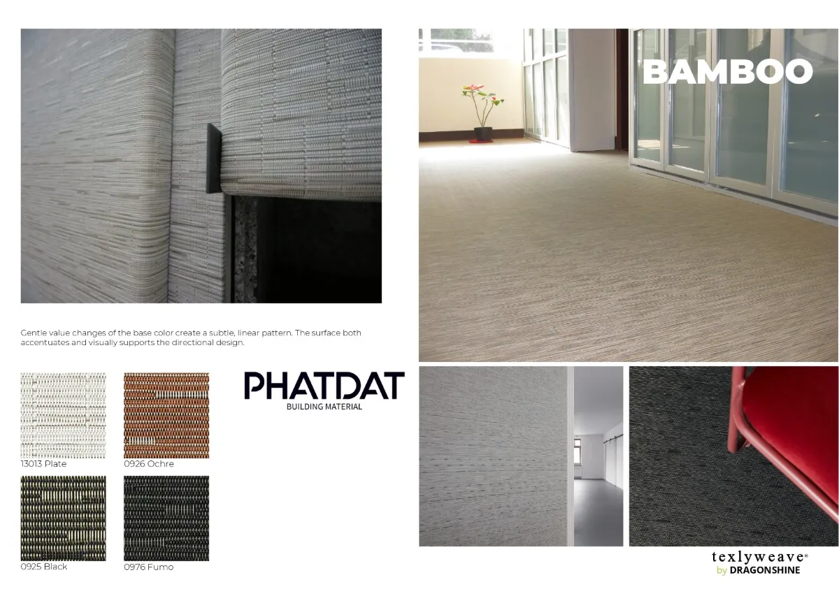 Sàn Vinyl Woven Texlyweave dòng Bamboo là giải pháp sàn trải toàn phòng (Wall to Wall Flooring) cao cấp, lấy cảm hứng từ vật liệu tre tự nhiên. Với kết cấu bề mặt dệt vinyl độc đáo, sản phẩm mang lại không gian sống tinh tế, hiện đại – phù hợp cho cả công trình dân dụng lẫn thương mại.