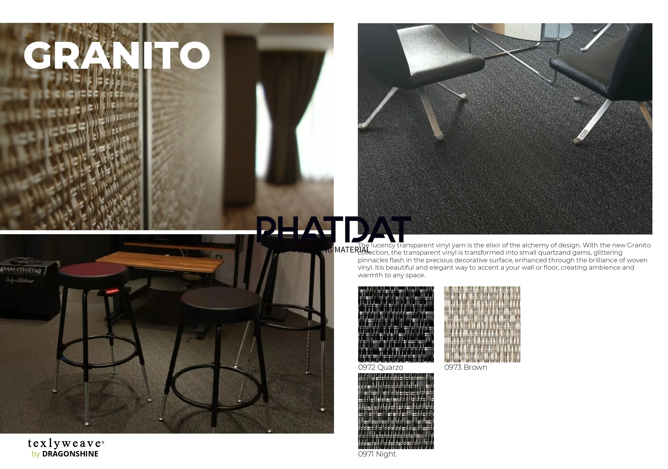 Sàn Vinyl Woven Texlyweave dòng Granito lấy cảm hứng từ vẻ đẹp của đá granite tự nhiên, tái hiện tinh tế những đường vân khoáng chất độc đáo qua kỹ thuật dệt vinyl cao cấp. Granito mang lại cảm giác sang trọng của vật liệu đá tự nhiên nhưng với ưu điểm vượt trội hơn về trọng lượng nhẹ, dễ thi công và khả năng chống ẩm bền bỉ.