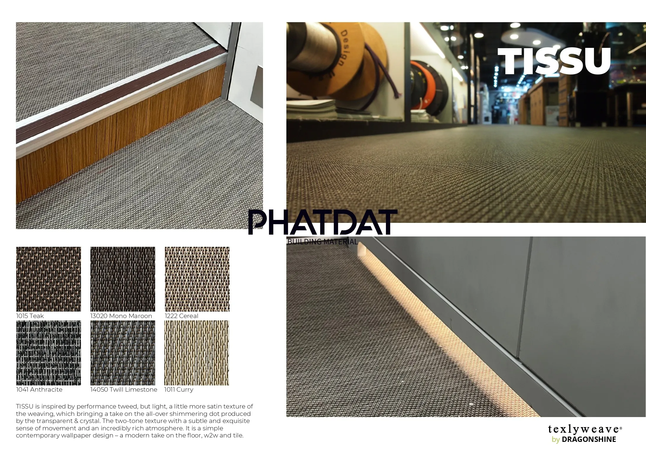 Sàn Vinyl Woven Texlyweave dòng Tissue nổi bật với kết cấu bề mặt dệt mịn nhẹ, tạo cảm giác ấm áp và tinh tế cho không gian sống và làm việc. Điểm khác biệt của dòng Tissue là tính linh hoạt trong quy cách – có thể lựa chọn dạng cuộn trải toàn phòng hoặc tấm module để dễ dàng thi công và thay thế theo từng công trình.