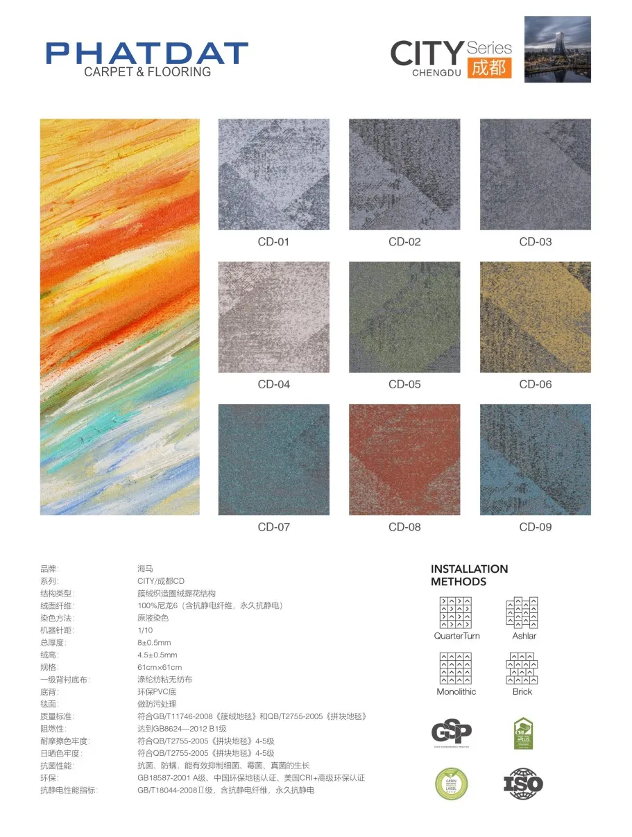 Thảm trải sàn City carpet với hoa văn đẳng cấp, hiện đại, độc lạ. Thảm trải sàn City là một trong những series được ưu thích lót nền nhà văn phòng cao cấp, chất lượng, sang trọng. Phatdatgroup cung cấp và thi công thảm trải sàn chuyên nghiệp.
