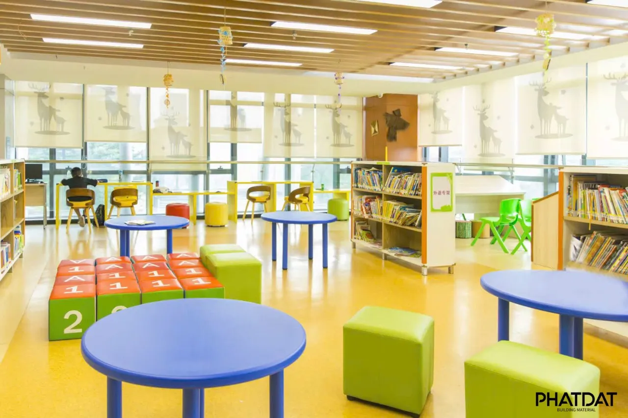 Bệnh viện là nơi tập trung nhiều vi khuẩn, virus và mầm bệnh. Sàn Vinyl được xử lý bề mặt bằng công nghệ ion bạc hoặc các hợp chất kháng khuẩn, ngăn chặn sự phát triển của vi khuẩn và nấm mốc. Đặc biệt, thiết kế dạng cuộn khổ lớn giúp hạn chế tối đa các đường nối – nơi thường tích tụ bụi bẩn và vi trùng.