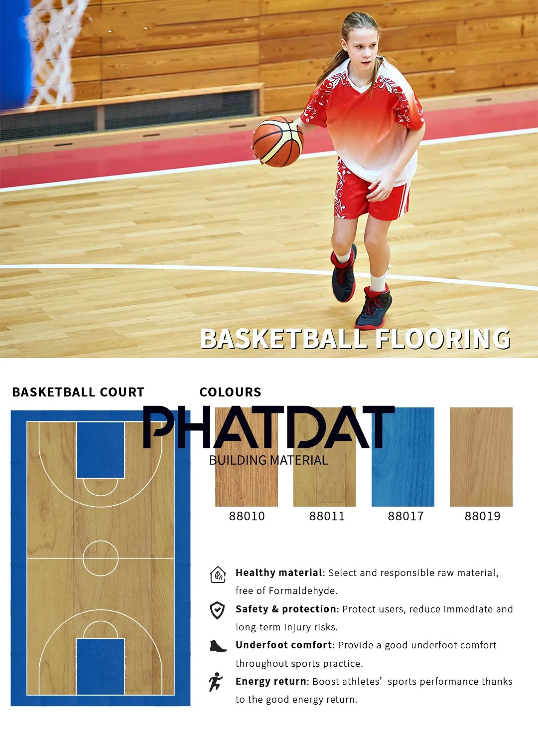 Sân Bóng Rổ & Nhà thi đấu đa năng: Các mã vân gỗ sồi (Oak) như BK-8001, BK-8002 mang lại vẻ đẹp sang trọng như sàn gỗ tự nhiên nhưng bền hơn và dễ bảo trì hơn.